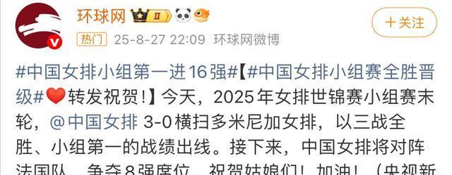 环球网官媒发表祝贺:“今天,2025年女排世锦赛小组赛末轮,中国女排 3-0横扫多米尼加女排,以三战全胜、小组第一的战绩出线。接下来,中国女排将对阵法国队,争夺8强席位。祝贺姑娘-们!加油!”